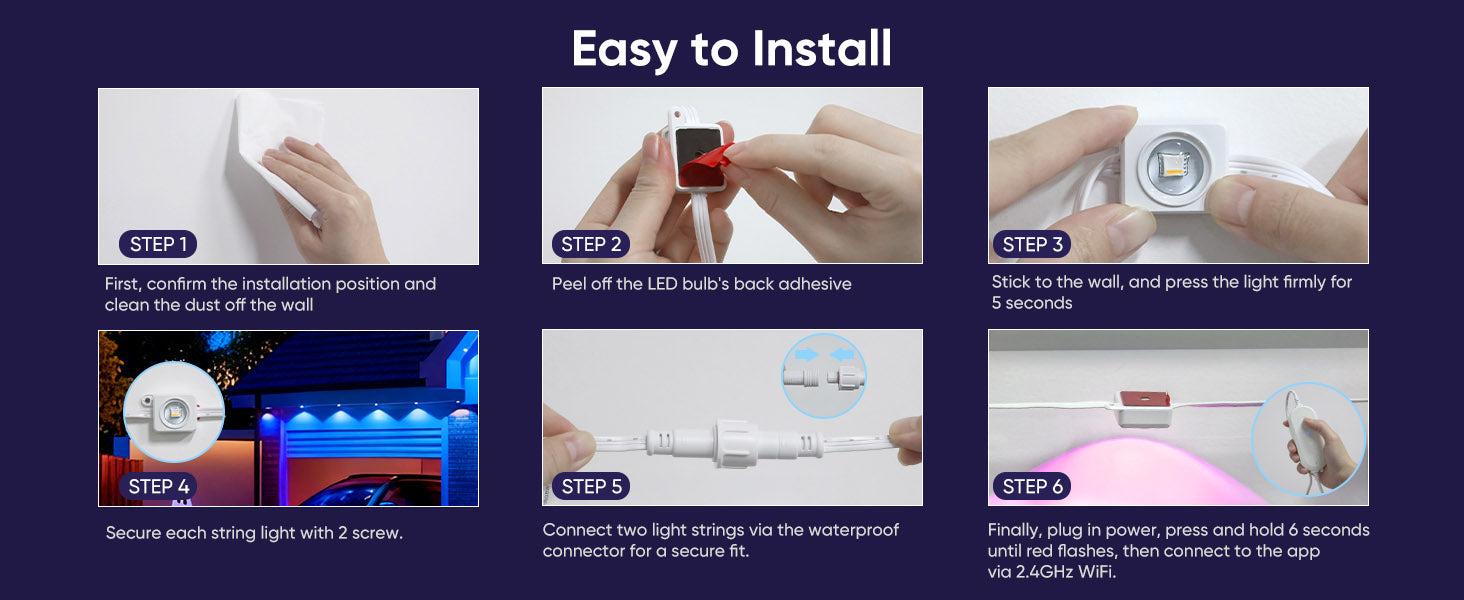 - Easy Installation: Set up your lights in minutes using the included accessories. Connect via 2.4GHz Wi-Fi for smooth performance—no hub required.