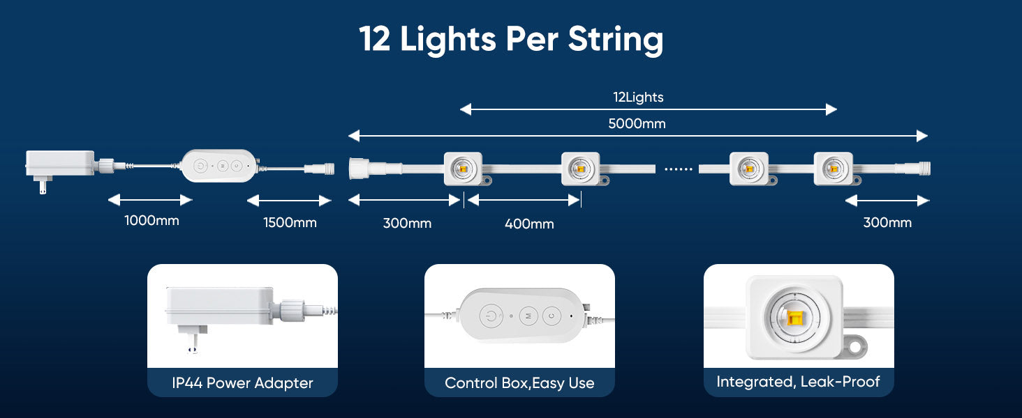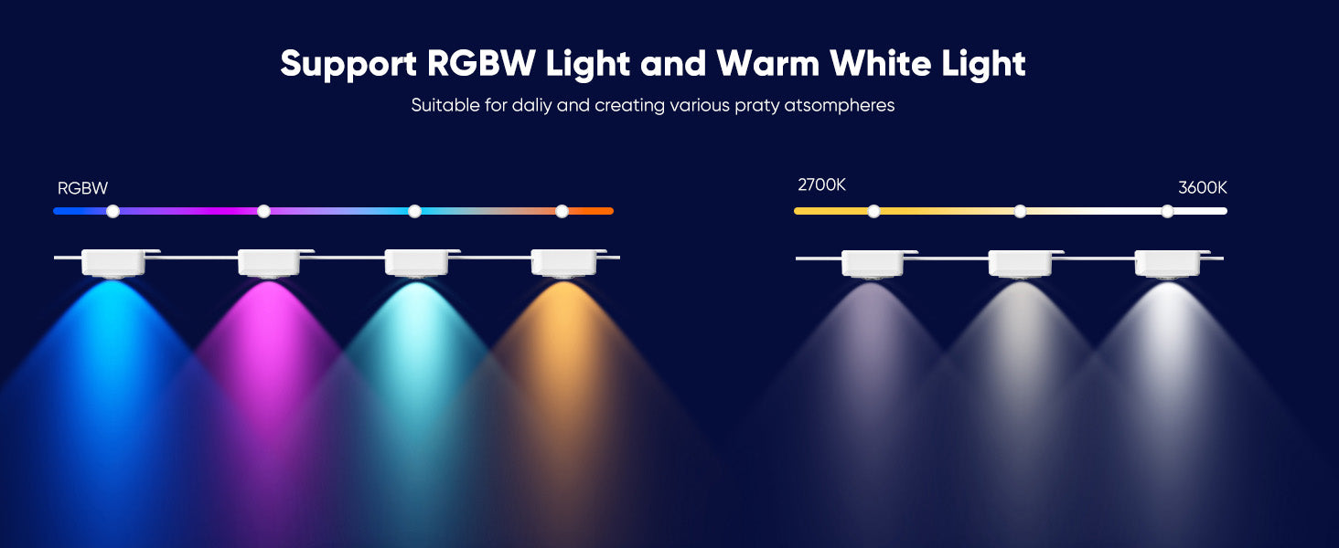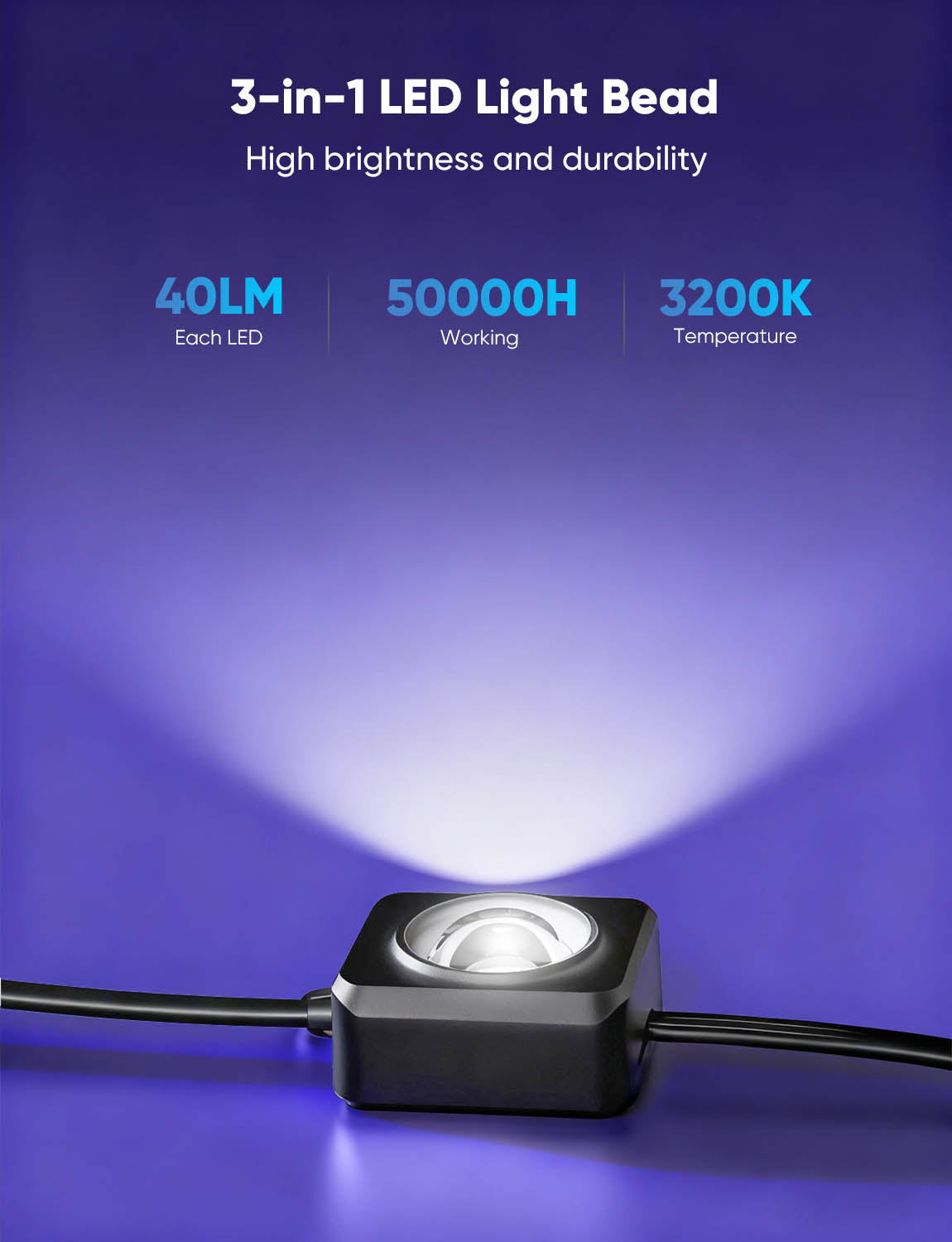 - Individual Light Control: Each light is individually addressable, allowing precise color customization and brightness adjustment. The RGBW spectrum supports both vibrant colors and warm white tones (2700K–3600K)—perfect for daily accent lighting or festive displays.