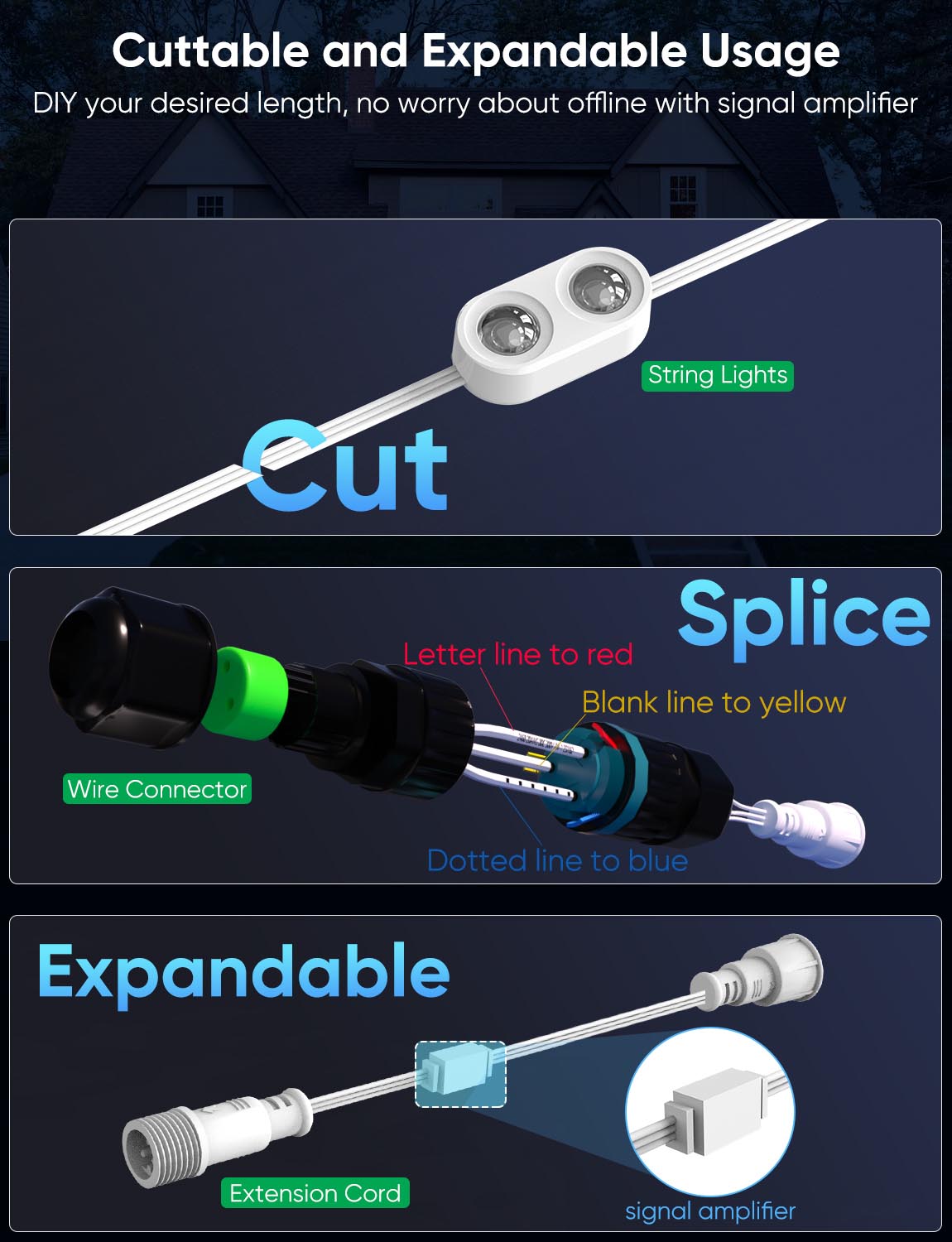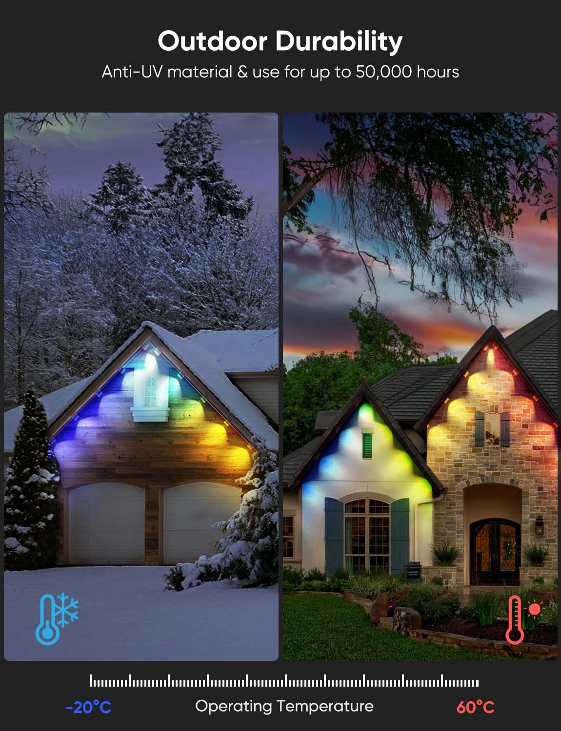 Outdoor Durability: The outdoor lights, control box and adapter are IP67 waterproof to withstand extreme weather. Thanks to UV-resistant materials, the permanent lights can withstand long time exposure without fading. Operates well from -4°F to 140°F, up to 50,000 hours working life, suitable for year-round lighting