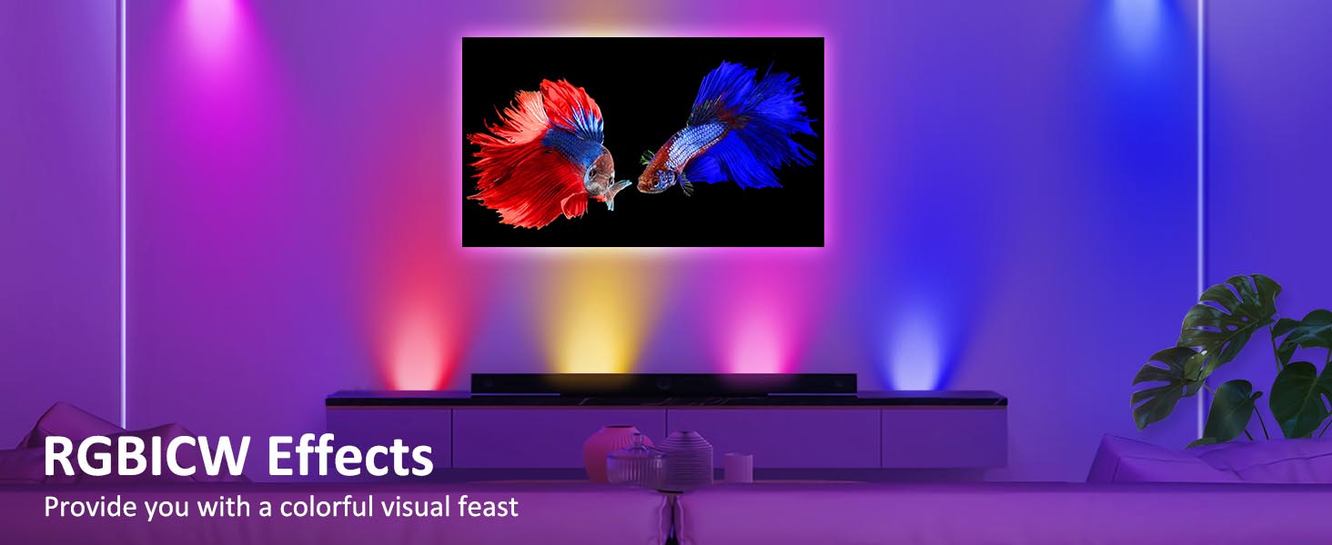 - RGBCW Effects:RGBCW lighting, 16 million colors, and 54 presets.