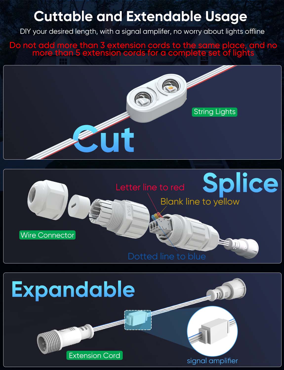 - Cuttable and Extendable: The outdoor permanent lights can be cut and extended by connecting an extension cord through wire connector set when specific area encountered.The extension cord can amplifiy the signal, up to 32.8ft/10m.