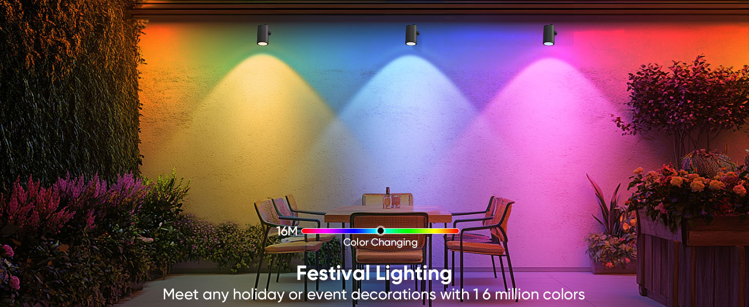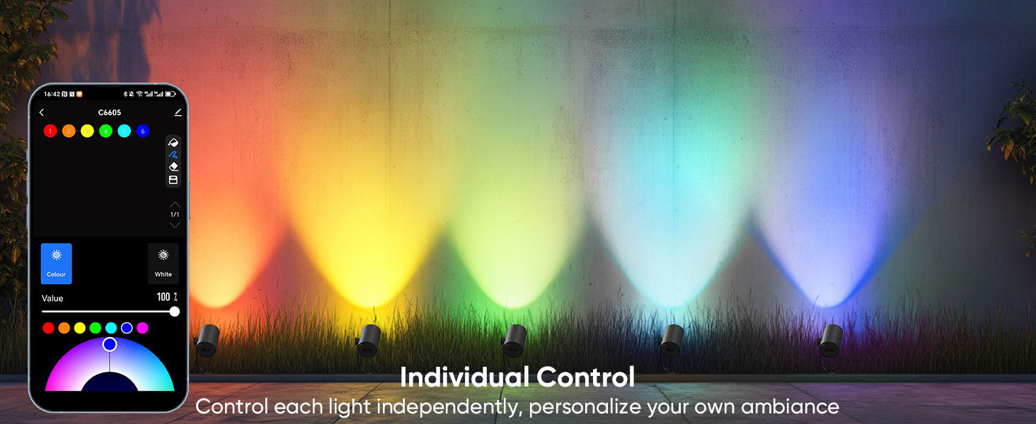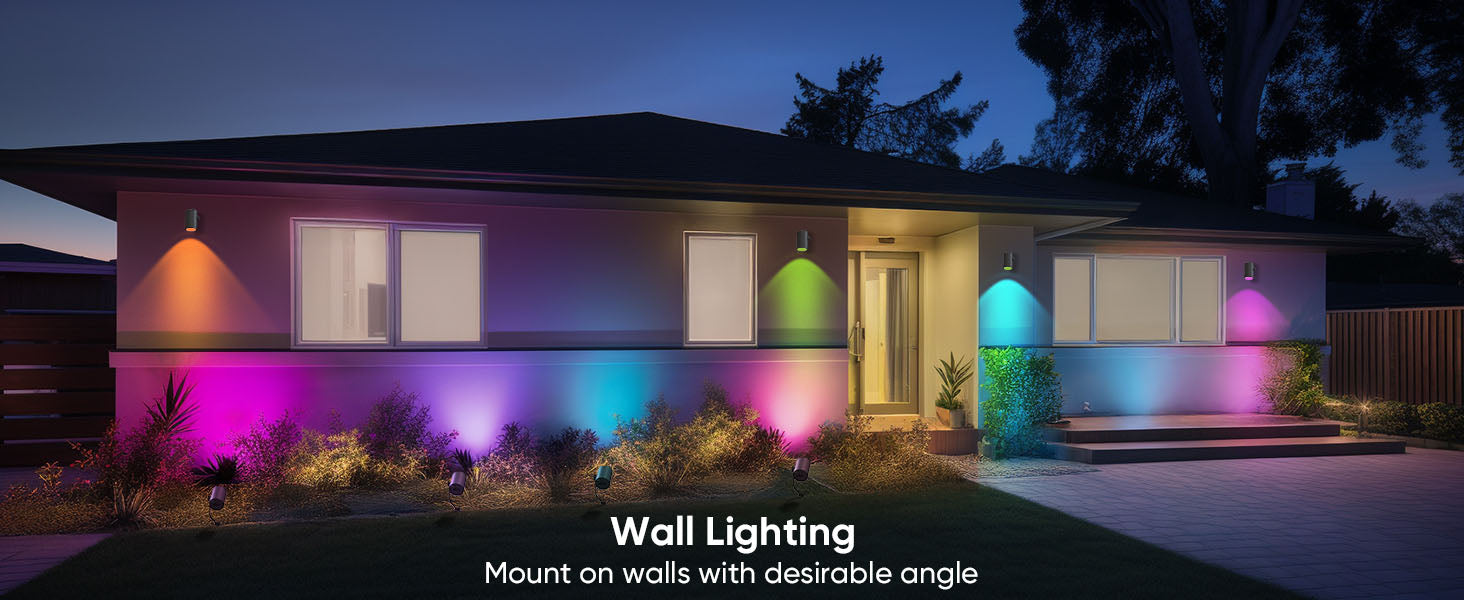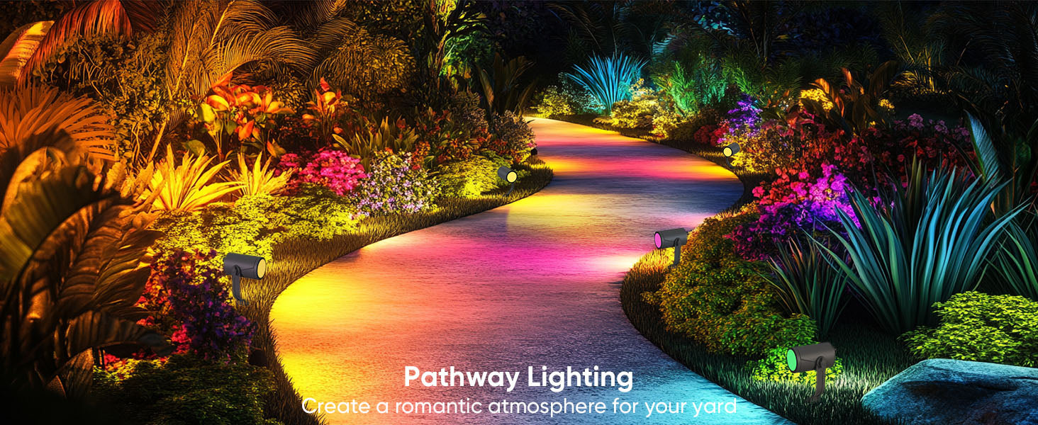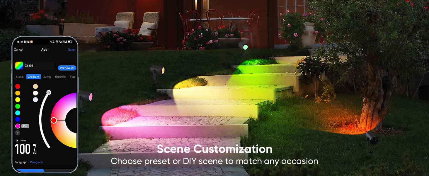 Whether you want to light up your garden, lawn, or fence, or add a touch of ambiance to your holiday parties, discover an outdoor ambiance you'll love with our RGBIC outdoor spotlights. customize your lighting effects with 16 million color options,111 scene modes, music mode, IP67 waterproof rating, and DIY mode to enjoy a personalized lighting experience like never before.