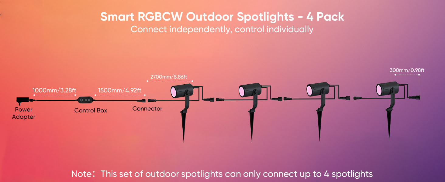 I have numerous Appeck lights around the inside of my house and love them, so it was a no brainer to try the outdoor spotlights. WOW, they exceeded my expectations. They look amazing and are easily controlled by my phone. I can randomly change the colors of each light depending on mood. Great value!